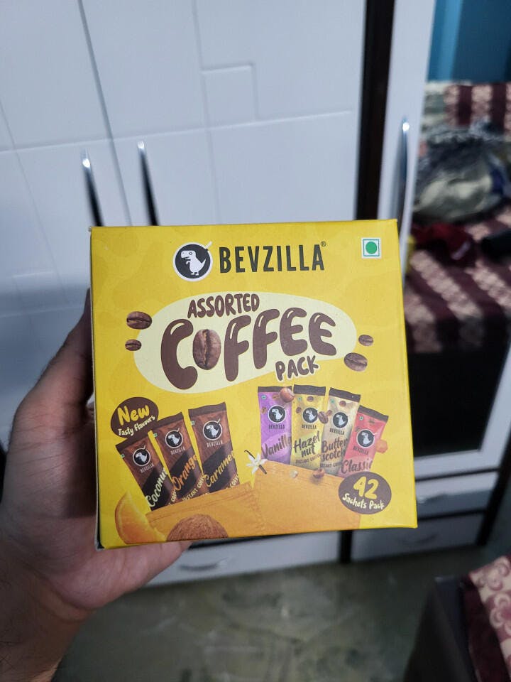 A: 84 sachets of flavoured coffee powder - Classic, Vanilla, Butterscotch, Hazelnut, Caramel, Coconut, and Orange ( 6 sachets of each flavour)