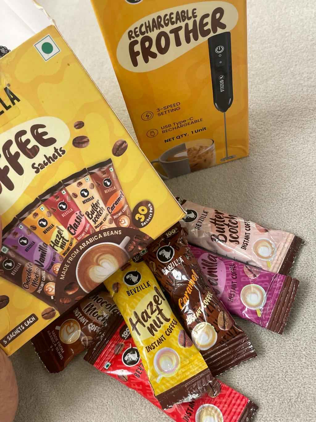 A. The combo includes 30 assorted coffee powder sachets plus a Rechargeable Fother.