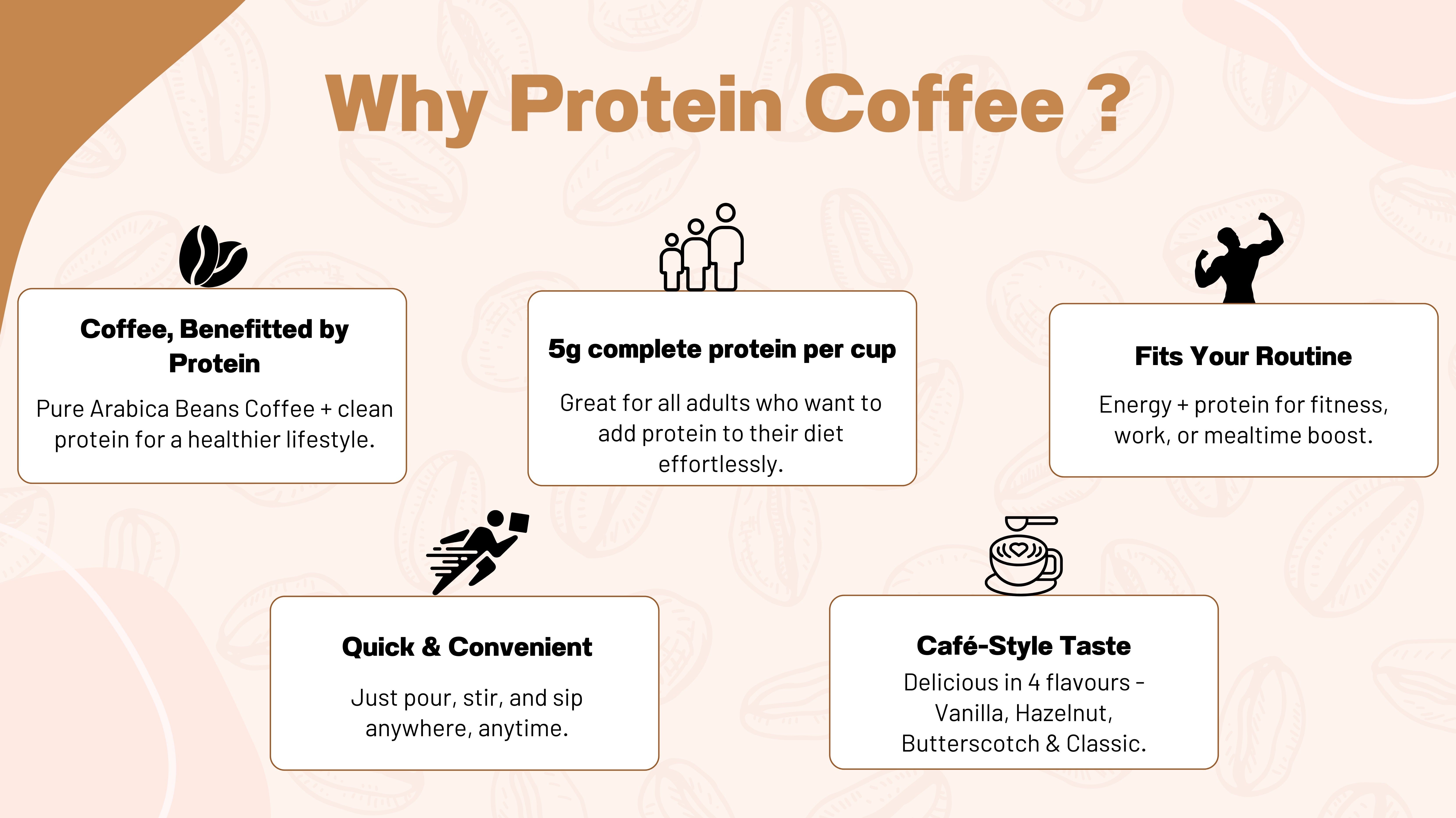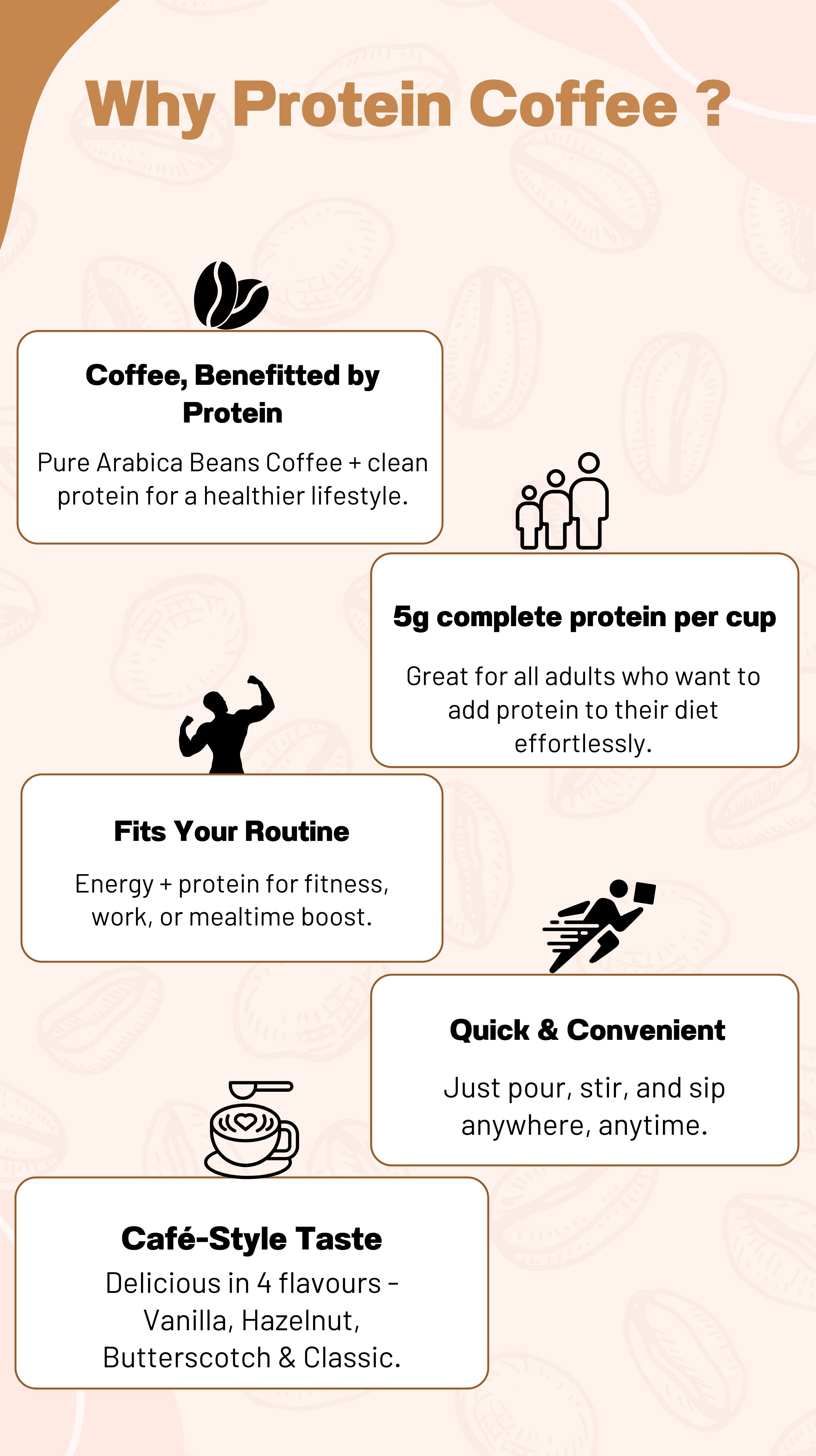 Protein Coffee is a smart blend of premium Arabica coffee and clean protein, giving you the taste of café-style coffee with the added benefit of 5g protein per cup.